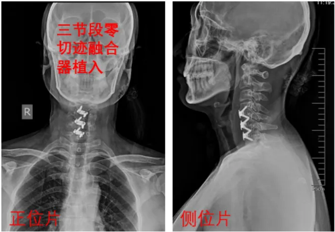 该患者长期受多节段双侧症状神经根型颈椎病困扰,经我院骨五科诊断,决定采取颈椎前路三节段颈椎间盘切除零切迹融合器植入固定手术进行治疗。该手术以往都是在肉眼直视下进行,手术切口会根据手术节段的增加进行延长,对患者的创伤也相应增加。