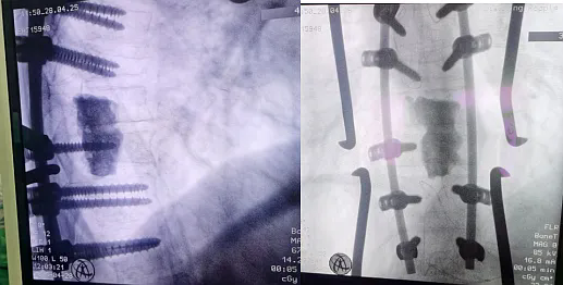 术前,为患者进行了包括补液、抗心律失常治疗等术前准备,以改善心脏功能,降低手术风险。术中,医护团队对病变椎体进行了部分切除,解除了脊髓的压迫,并使用骨水泥进行了充分隔离。同时,对病变椎体上下各两个节段进行了钉棒固定(图3),以确保脊柱的稳定性。