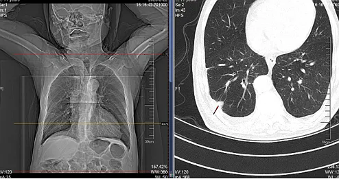 自述胸背痛已有2个月,来诊前近7小时症状加重并伴有双下肢麻木无力。经检查发现,患者胸背部有明显叩痛,双下肢肌力为0级,腱反射消失,大小便不能自主控制。胸椎MRI和CT检查提示胸9-10椎体及附件异常信号影(图1),椎管内脊髓受压严重,同时双肺CT发现右肺占位(图2),考虑为脊柱转移瘤。