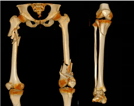 脾破裂、左肱骨骨折、颅骨多发骨折及下颌骨骨折