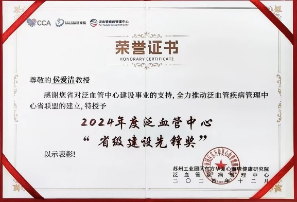我院侯爱洁教授以其高超的医术和创新精神,在本地区泛血管领域树立了标杆,在推动省联盟的成立和运作中发挥了关键作用,被授予2024年度泛血管中心“省级建设先锋奖”。