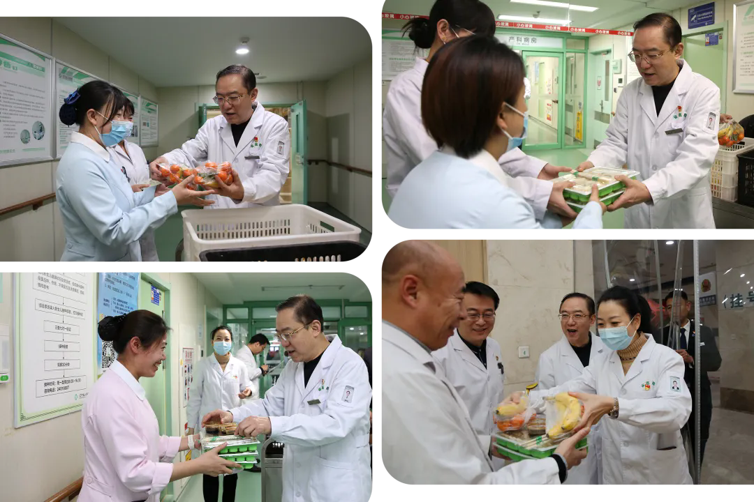 院长臧培卓、纪委书记丁大璐带队慰问放射科、急诊、儿科、药学部、夜间配送、检验医学科、心功能科、麻醉科、手术室、输血科、ICU、心外科、肾病学科、产科、妇科、消化内二科、骨五科等科室。医务处负责人陪同慰问。