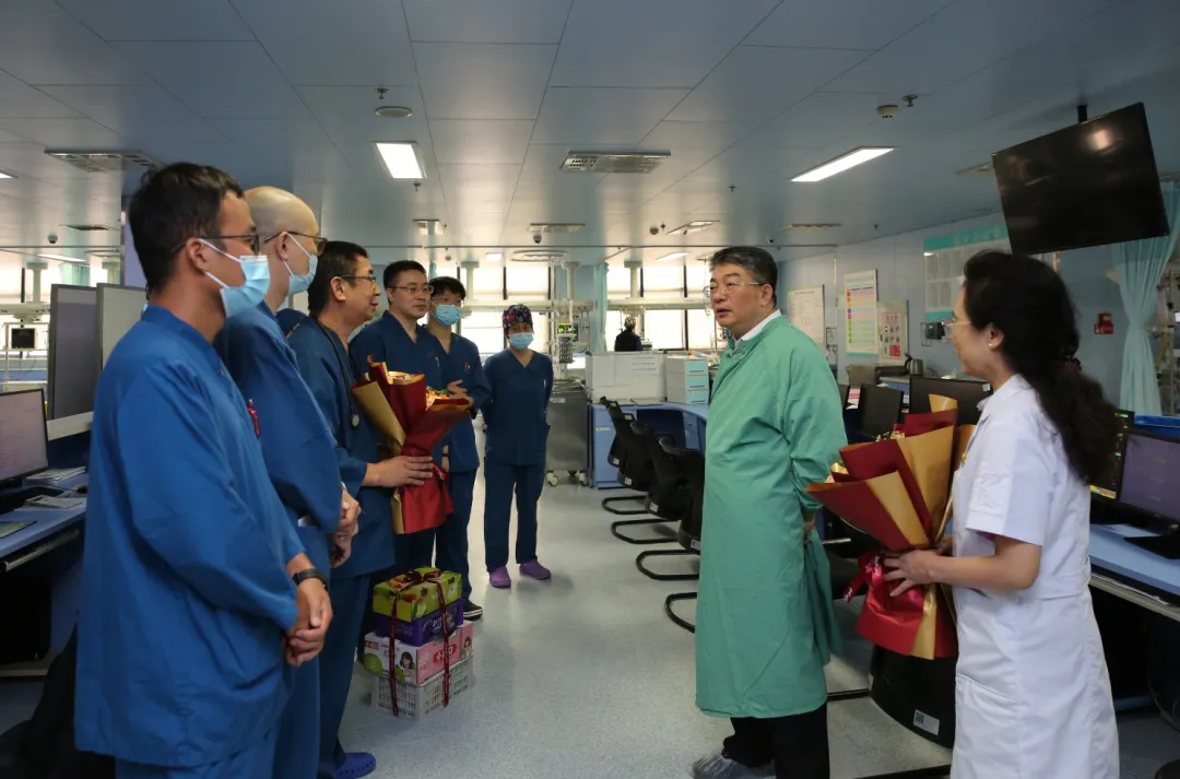 党委书记曲鹏带队到重症医学科慰问医生团队时勉励大家:重症医学科团队是我院提升疑难技术、解决救治危重疑难病患者的保障团队,也是我院守护患者生命的优质服务团队的表率。你们辛苦了!希望未来不断精进,用更好的医术更好的医德团结协作,服务更广大患者!