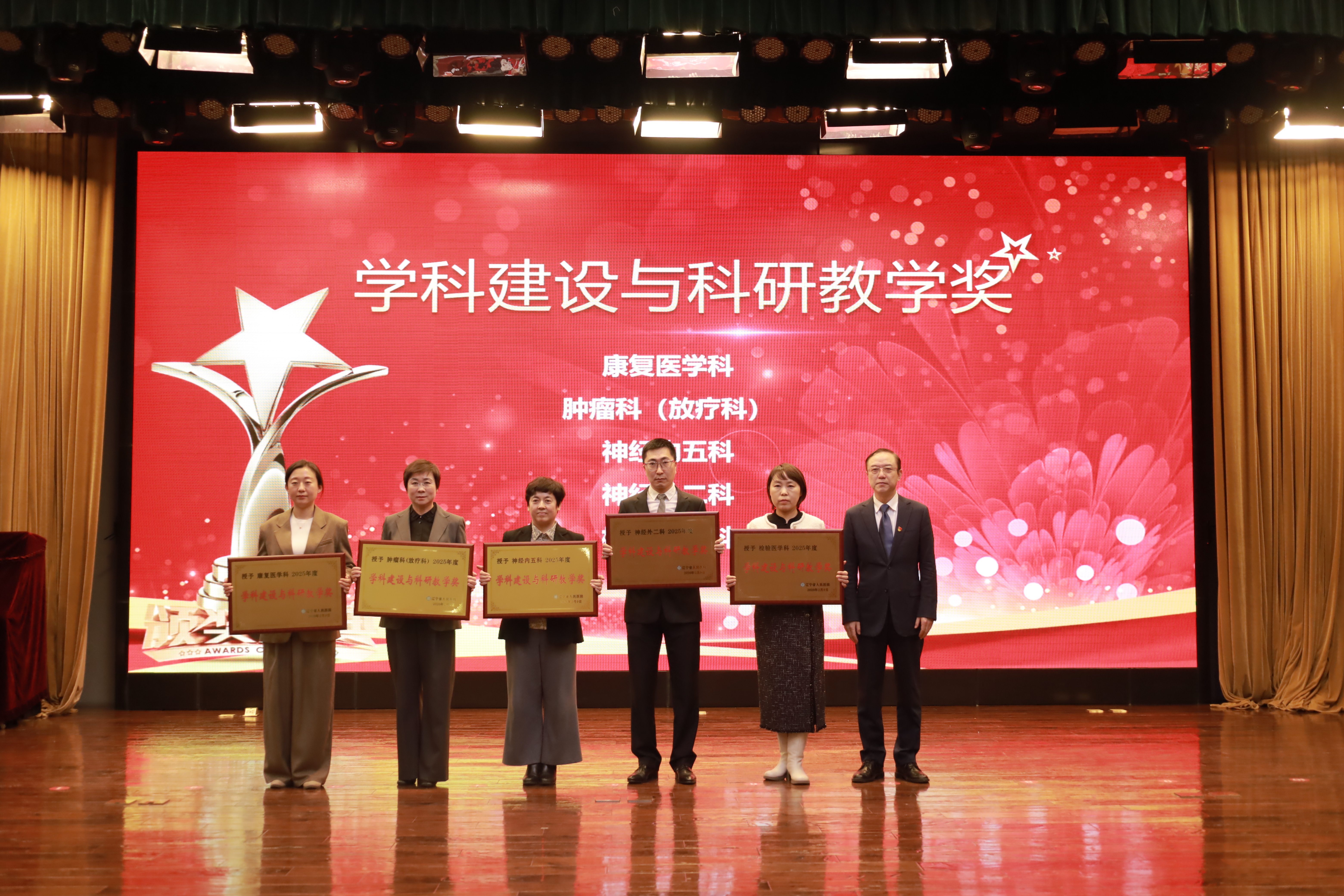 院长臧培卓为学科建设与科研教学奖颁奖:康复医学科、肿瘤科(放疗科)、神经内五科、神经外二科、检验医学科