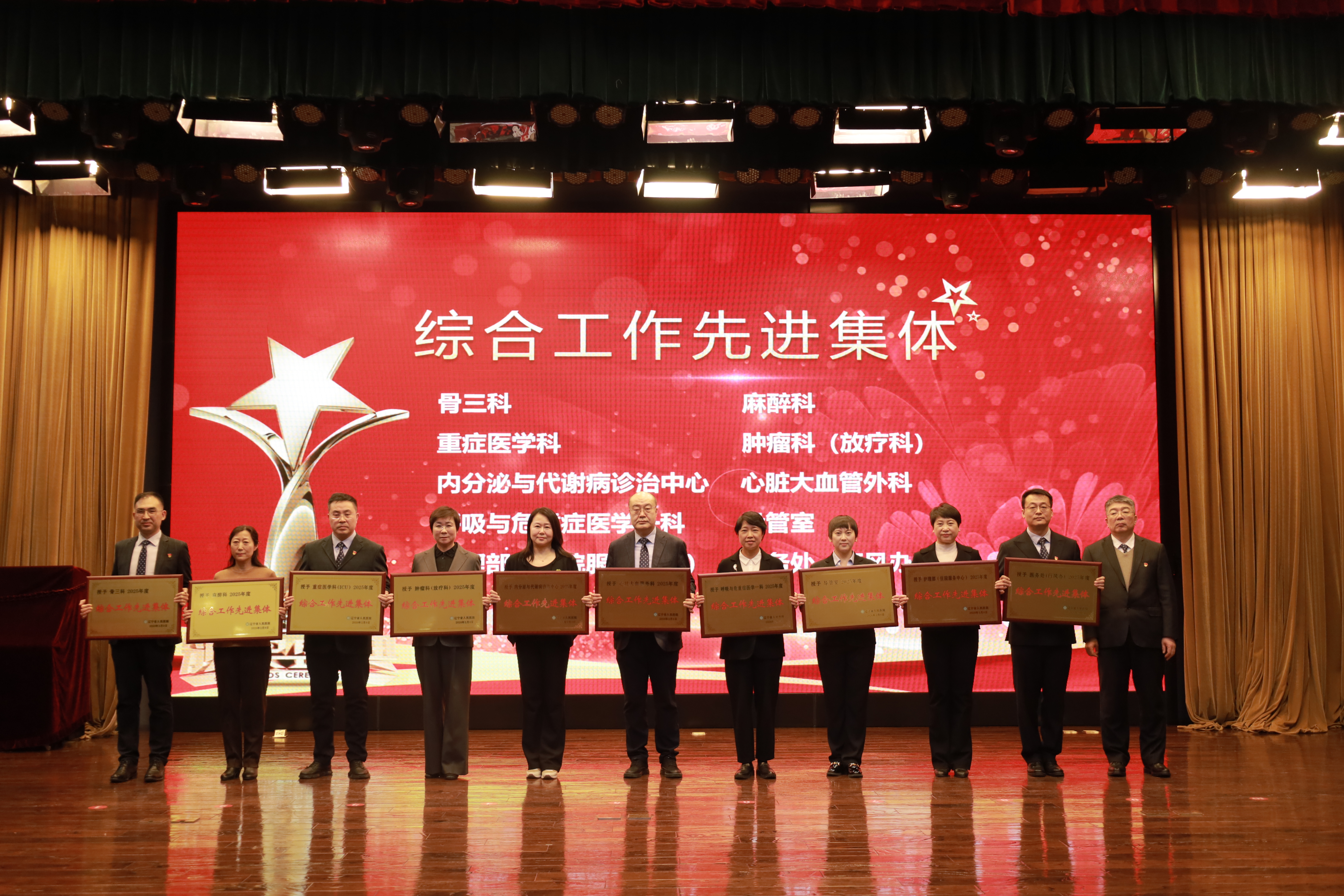 党委书记曲鹏为综合先进集体奖颁奖:骨三科(运动医学与关节外科)、麻醉科、重症医学科、肿瘤科(放疗科)、内分泌与代谢病诊治中心、心脏大血管外科、呼吸与危重症医学一科、导管室、护理部(住院服务中心)、医务处(行风办)