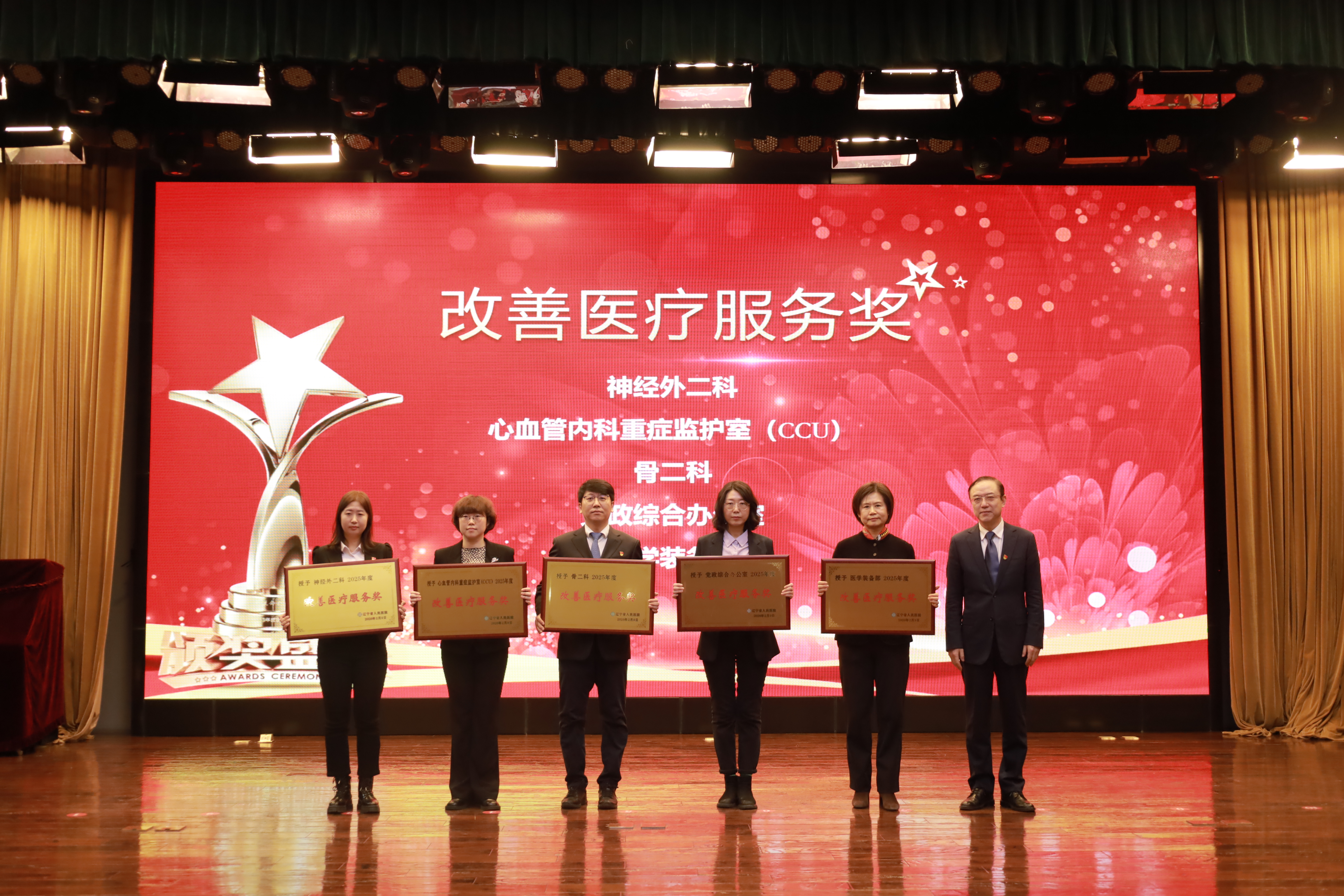 院长臧培卓为改善医疗服务奖颁奖:神经外二科、心血管内科重症监护室(CCU)、骨二科(创伤与关节外科)、党政综合办公室、医学装备部