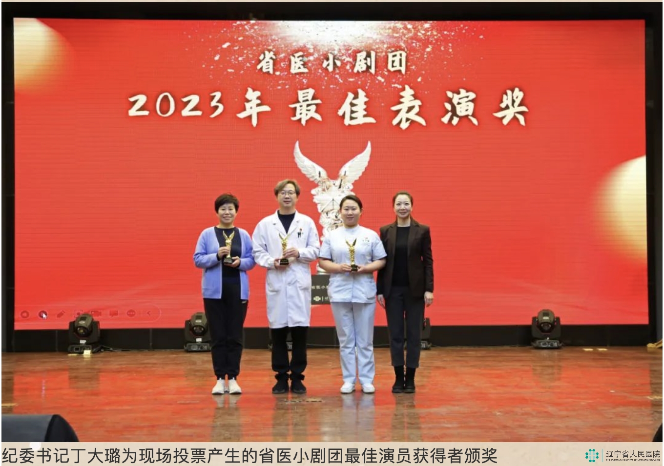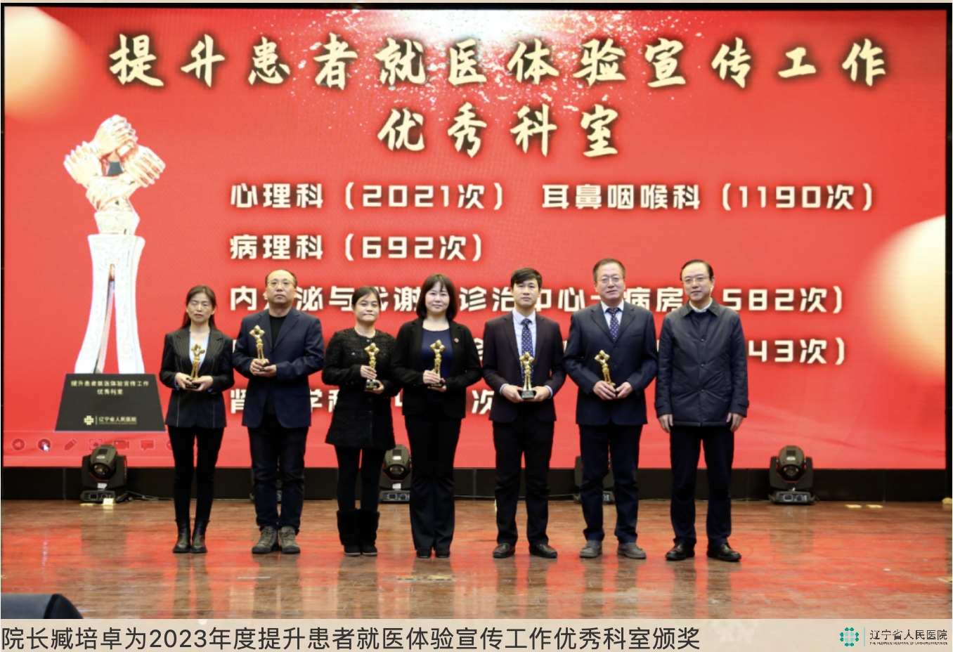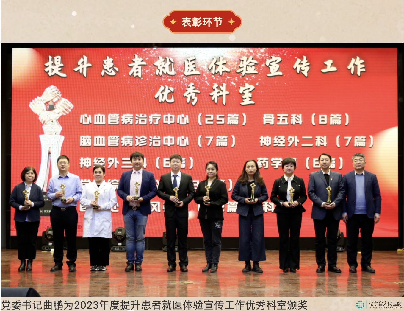 副院长李艳玲宣读了《关于表彰2023年提升患者就医体验宣传工作优秀集体和个人的决定》文件,会议由纪委书记丁大璐主持。院党政领导班子为获奖者颁发了奖杯。