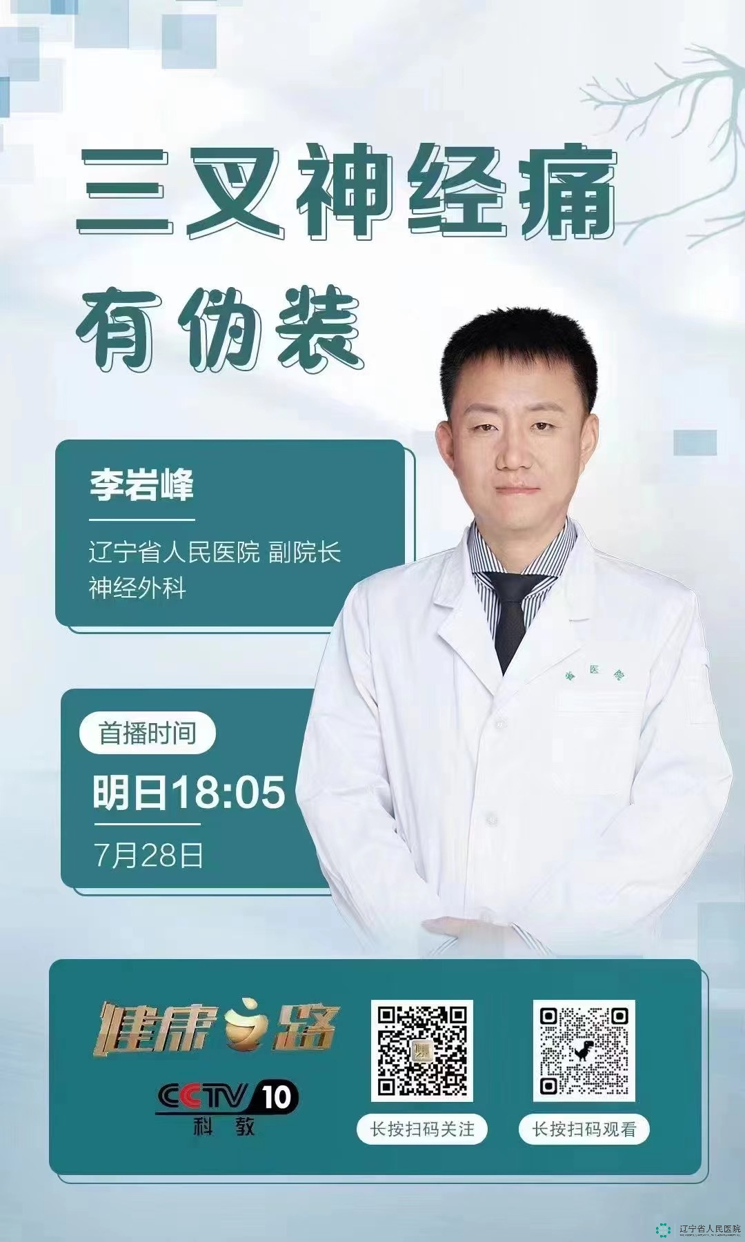 7月28日18:05分,我院副院长、神经外科专家李岩峰将作客央视科教频道《健康之路》栏目直播间,为您讲解“三叉神经痛有伪装”。将以通俗易懂的语言为您解读三叉神经痛的症状,帮助您尽早识别、尽早接受专业治疗,摆脱痛苦。
