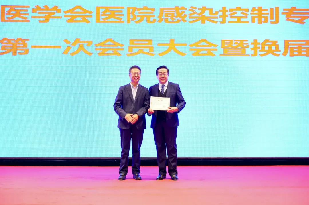 省预防医学会会长杨佐森为第七届医院感染控制专业委员会主任委员韩克军颁发聘书