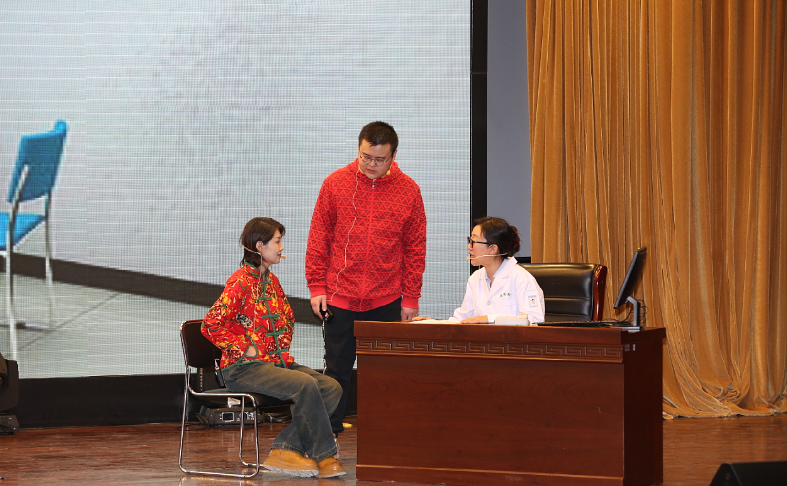 本场演出在医院党政领导的指导下,由文化宣传中心主办,演职人员是来自妇科、脑血管病诊治中心、康复医学科、中医科、超声医学科、普外六科(急诊外科病房)、急诊医学科、口腔科、骨科、放射科、血液内科、神经外科、医务处、护理部、眼科等十余个临床科室的20余位医护人员,并特邀副院长李艳玲、卜献民参演,大家牺牲休息时间研读剧本、背诵台词、构思舞台设计以增强演出效果……历时一个多月,经过5次修改剧本、4次现场排练,共同创造了这台精彩纷呈的演出。
