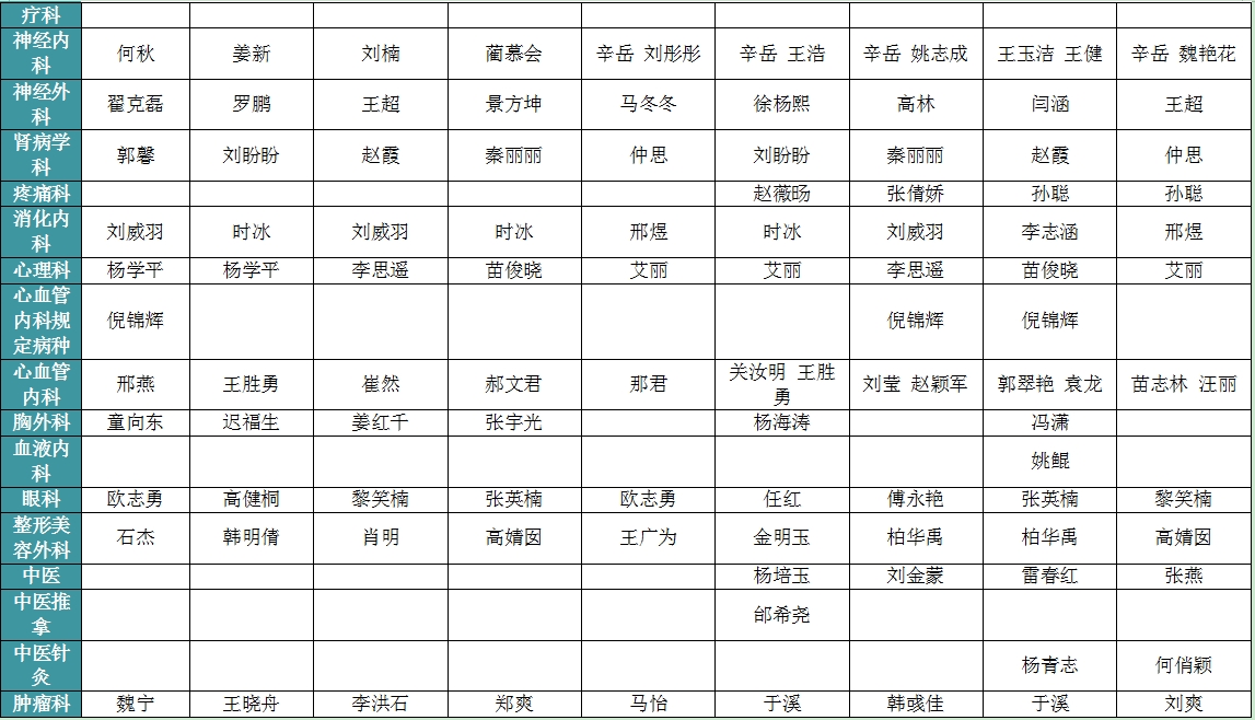 内科(心血管内科、呼吸与危重症、消化内科、内分泌与代谢病、肾病学科、神经内科、心理科);外科(普外科、神经外科、泌尿外科、整形美容外科、骨科、骨与软组织肿瘤科);五官(耳鼻咽喉科、口腔科、眼科);皮肤科;肿瘤科;介入医学科;妇科;儿科;消化内镜中心;感染科;康复医学科;全科医疗科(2月20日至23日开诊);风湿免疫科(2月19日、21日至23日开诊);血液内科(2月22日开诊);胸外科(2月15日至18日、20日、22日开诊);疼痛科(2月20日至23日开诊);中医(2月20日至23日开诊)、中医针灸(2月22日、23日开诊)、中医推拿(2月20日开诊)。