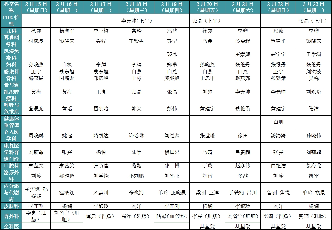 一、2026年2月15日(周日)至23日(周一)节日期间急诊、儿科急诊正常开诊;门诊比照周末模式,联合开诊。
